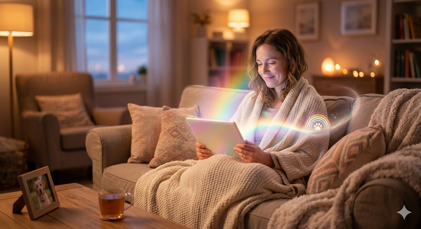 We create custom Rainbow Bridge memorial videos to bring that same comfort to you: your pet's photos brought to life in heavenly scenes, your choice of themes, gentle poems, and uplifting music. Every tribute is made with the love I wish I'd had more of in that moment.